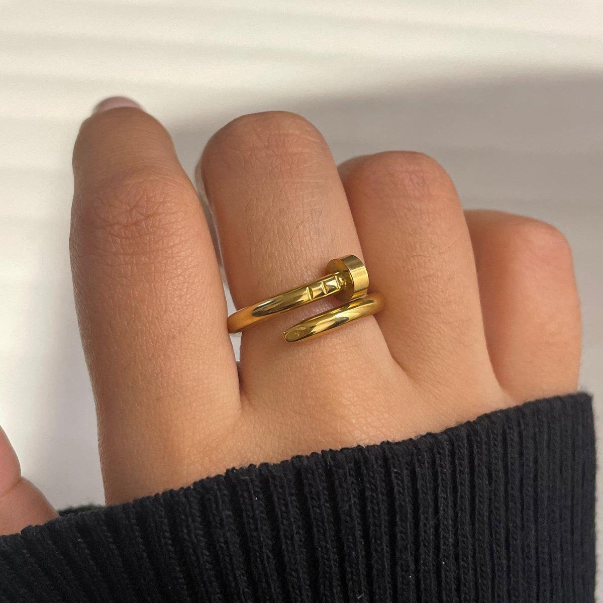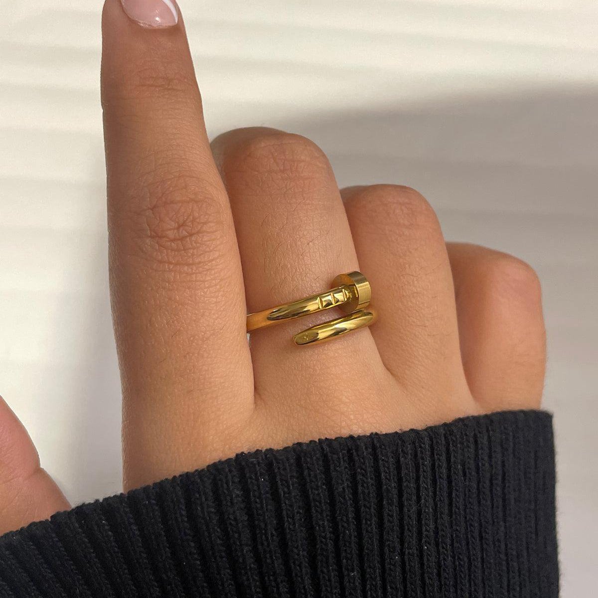A bold fusion of industrial inspiration and minimalist beauty, this Nail Twist Ring brings sleek sophistication to your everyday style. Its smooth finish and sculptural design make it a standout piece for modern wardrobes.