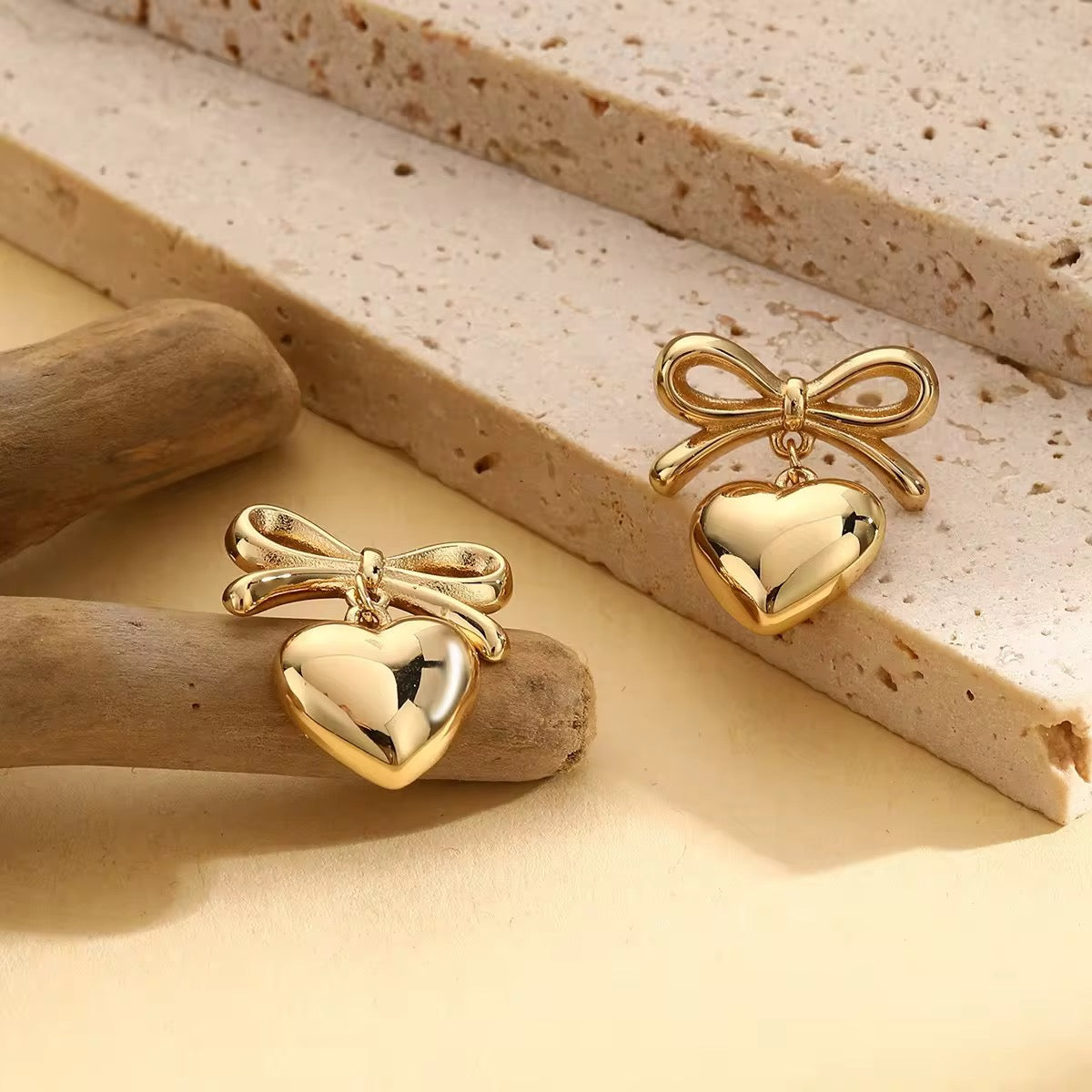 Romantic Silhouette – Heart charm gracefully paired with bow. Golden Radiance – Brilliant polished finish for luxe appeal. Complete Set – Necklace with perfectly matching earrings. Lightweight Elegance – Comfortable for daily or evening wear. Versatile Styling – Complements casual chic and formal looks.